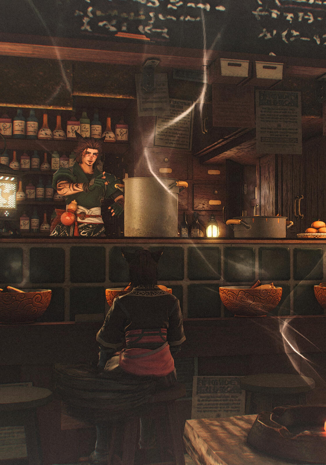 After ending up in the back of an air ship as it was leaving La Noscea Kugane, they were shipped right off alongside the packed up Heavensturn decorations.And rats have to make do regardless! After a little looking around here and a lot of fixing up there, a previously abandoned ramen shop is up and running once more in a definitely not shady back alleyway in the city. 100% authentic ramen made by completely qualified 'chefs' who absolutely would not butcher all the recipes since there was a recipe book in the shop after all. Surely they can follow instructions, right? ...Right?